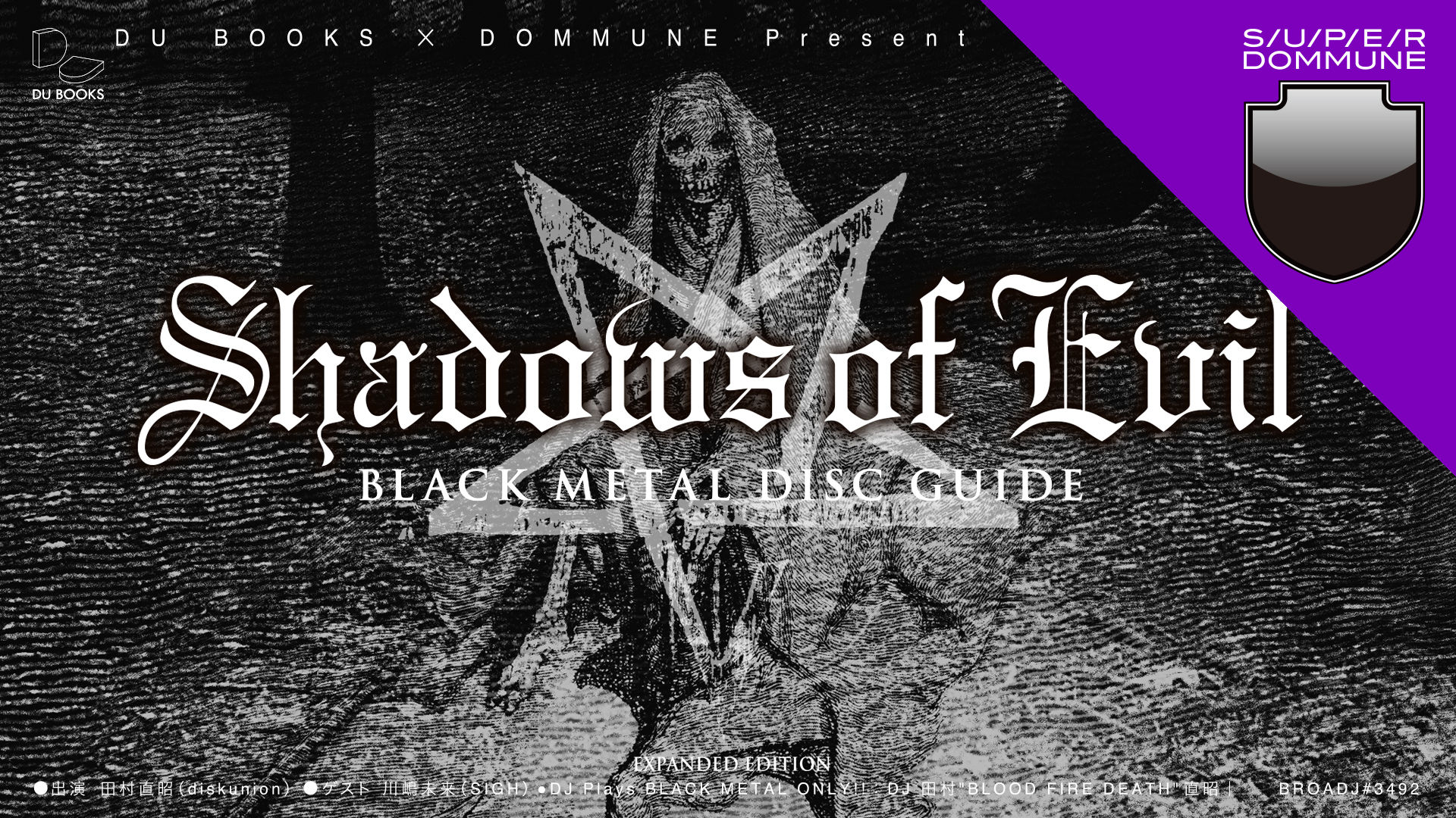 JAN 13 TUE DU BOOKS x DOMMUNE Present 実写版「SHADOWS OF EVIL - BLACK METAL DISC GUIDE」【増補版】●出演:田村直昭(diskunion)●ゲスト:川嶋未来(SIGH)●DJ Plays BLACK METAL ONLY!!:DJ 田村 "BLOOD FIRE DEATH" 直昭|BROADJ#3492
