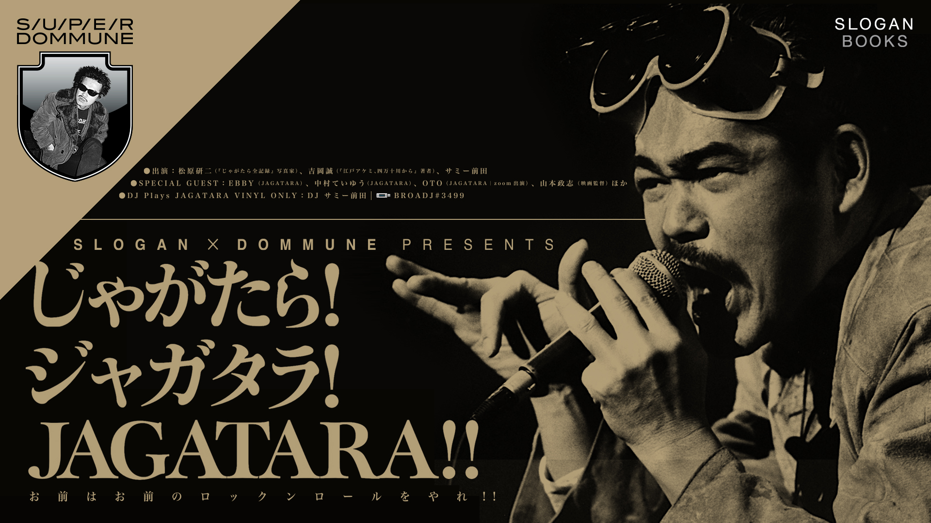 JAN 27 TUE SLOGAN × DOMMUNE presents 「じゃがたら! ジャガタラ! JAGATARA!!」〜お前はお前のロックンロールをやれ!! ●出演:松原研二、吉岡誠、サミー前田 ●SPECIAL GUEST:EBBY、中村ていゆう、OTO、山本政志 ほか ●DJ Plays JAGATARA VINYL ONLY:DJ サミー前田