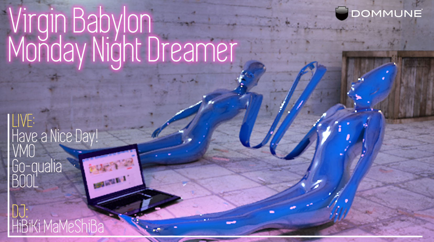 ■5.28に渋谷WWWで開催されるVirgin Babylon Records主催のレーベル・イベント『Virgin Babylon Night 3』!5.25にTSUTAYA O-WESTで開催されるHave a Nice Day! ワンマンショー『HELTER SKELTERS DISCO SHOWCASE』!twitterトレンド上位入りでも話題を集めた神回「POEMCORE」~OMOSHIRO DARKNESS IN DOMMUNE~ではBOOLやAMANDAとのコラボ・ポエムコア・パフォーマンスも披露した越境者HiBiKi MaMeShiBaをプロデューサーに迎え、DOMMUNEでは、これら2つのイベントの魅力を凝縮してお届けするプレ・イベント番組『Virgin Babylon Monday Night Dreamer』をお届けします!!!!!!!!!!!! |