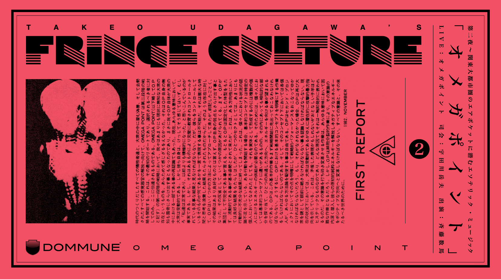 日本のヒッピー・ムーブメントは反戦・反核・反原発運動やエコロジー運動、禅やインド哲学、さらにはネイティブアメリカン、沖縄、アイヌといった先住民の運動といった、さまざまなカウンター・カルチャーの合流する場として60年代から現在まで連綿と地下水脈のように続いている。今回紹介するオメガポイントオーガニゼーションの中心人物齋藤数馬は、70年代に美學校に籍を置き、そこで松沢宥に師事してコンセプチャル・アートを制作するようになり、やがて小杉武久の影響をも受けながら、即興音楽表現としての活動を開始。90年代にはレコードショップ&レーベルオメガポイントを設立し、数多くのノイジミュージックのアーチストのCDをリリースした。21世紀に入ってのしばらくの休止の後に3・11以降の黙示録的状況の中でMusick & Magickとして再起動した。彼の提唱する音霊としての即興電子音楽とは何か?トークとライブでその実像に迫る。ゲストは持田保氏(Industrial Music for Industrial People著者) |