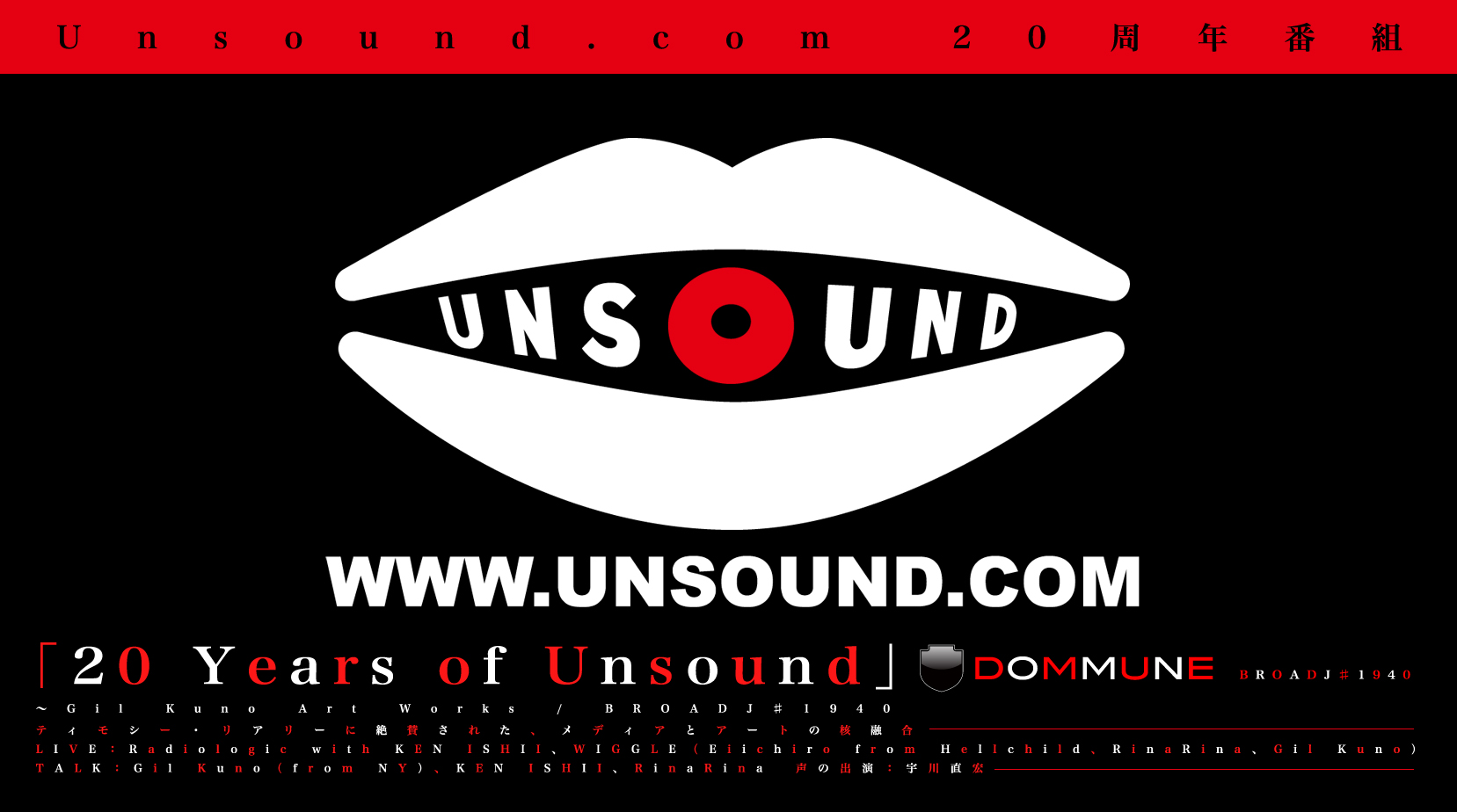 米国と日本を拠点とし、インスタレーション、サウンドアート、パフォーマンス、陶器などジャンルを問わない表現手段で国際的に活動するGil Kuno。彼の運営するUnsound.comは、90年代、Timothy Learyに絶賛されたWEBサイトだ。そんなUnsound.comが今年、20周年を迎える!20周年を記念してDOMMUENでは、ケン・イシイ他、縁あるアーティスト達を迎え、スペシャルプログラムが配信!ニューヨークFringe FestivalでソールドアウトしたSix String Sonics、世界初のインターネットバンドWiggle、5カ国で展示されたHaze等、世界中で数多くの作品を発表している彼の現在形を見届けよ!