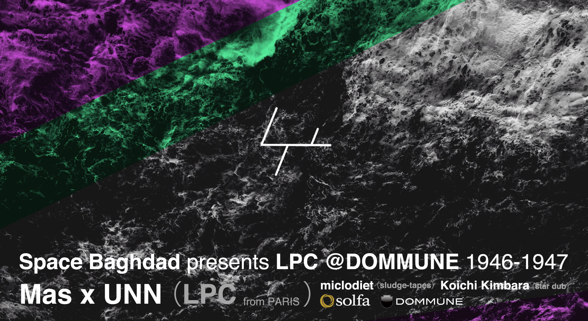 今までに、Dadub,Inner8,UVB,Lumisokeaなどの初来日公演を実現させてきたSpace Baghdadクルー。 今回のゲストはフランス・パリを拠点に活動しているLPC(MAS,Keadz,VJ UNN)。 今年4月に東欧Genesa Recordsから"Psychic EP"をリリースしたmiclodiet、新進気鋭の音楽家Koichi Kimbaraをサポートに迎えての開催!! |