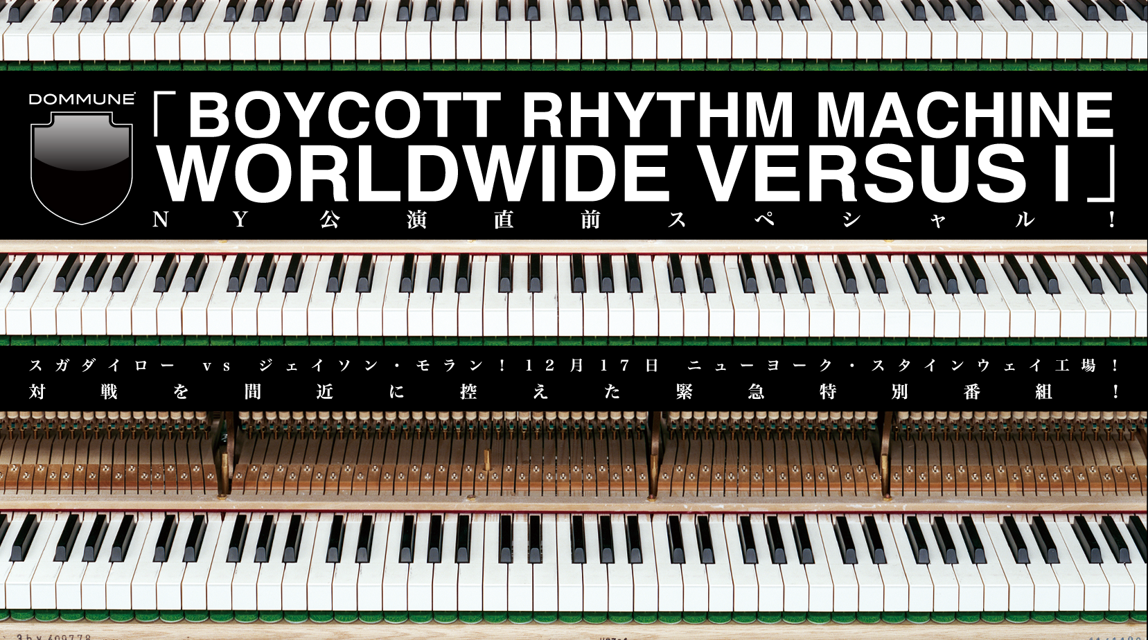■BOYCOTT RHYTHM MACHINE WORLDWIDE VERSUS I スガダイロー vs ジェイソン・モラン!12月17日 ニューヨーク・スタインウェイ工場! 対戦を間近に控えた緊急特別番組! 2組の音楽家が、何も決め事なく自由に即興的に音楽を奏であう『BOYCOTT RHYTHM MACHINE VERSUS』プロジェクト。日本人音楽家が世界の各大陸に挑んでいく『WORLDWIDE VERSUS』シリーズの第1回をニューヨークで開催します。ジャスを生んだ国アメリカに、たった一人で日本人ジャズピアニスト・スガダイローが戦いに挑みます。相手は、ブルーノートで数々の名作を世に送り出してきたワールドクラスのジャズピアニスト・JASON MORAN。会場は、ニューヨークにあるスタインウェイ工場。現地時間 2016年12月17日19時、開演!これまでのBOYCOTT対戦映像やスガダイローの即興名勝負を振り返りながら、間近に迫った公演の全貌をお伝えします!!! |