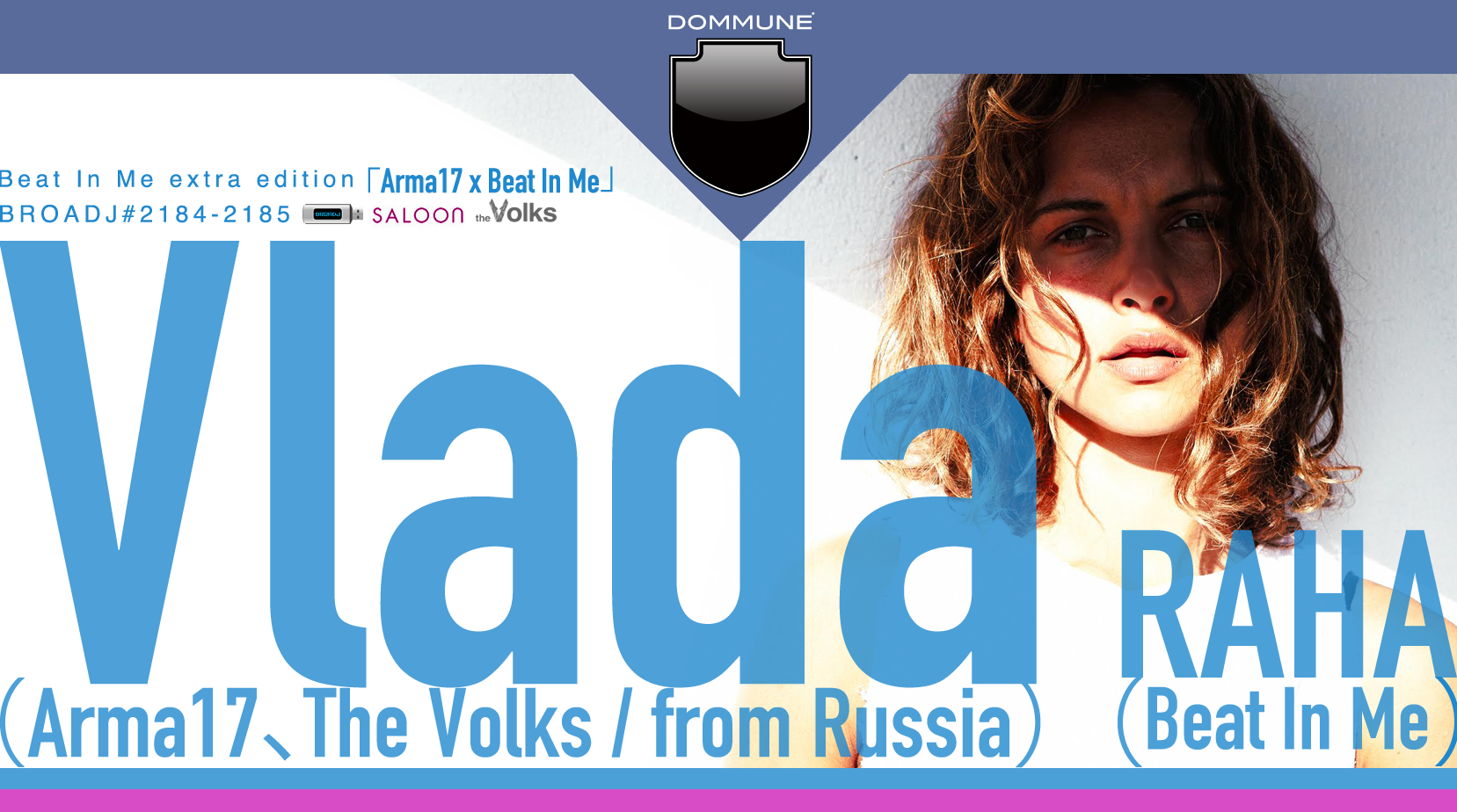 世界のミニマルテクノ/ハウスシーンを席巻中のルーマニアンサウンドを紹介するパーティー “Beat In Me” の今回は番外編として、ロシアのアンダーグラウンド・シーンのトップブランド "Arma17” のレジデントの1人 “Vlada” を迎え、Beat In MeレジデントのRAHAと共にお送りする。「Spinning around」は、彼女のレコードとライフスタイルの両方に関連する定義である。モスクワ出身で現在はベルリンを拠点とするVladaは、10年以上にわたり世界中のエレクトロミュージックシーンに深く傾倒してきた結果、ここ数年ではこのArma17のレジデントの1人として活動する傍ら、近年はco-founderとして人気パーティーThe Volksを立ち上げ主宰し、ヨーロッパ各地でもその活動の場を広げている。一方、このDOMMUNEにおいては、あのRhadoo, Petre Inspirescuらを始め数々のルーマニアのトップアーティストを招聘し過去10回以上のプログラムを主宰してきたBeat In Me。来たる4/1にはLIQUIDROOMにて、世界のアンダーグラウンドミュージックを席巻するルーマニアン・シーンのボス、Rhadoo, Petre Inspirescu, Rareshの3人によるスペシャルユニットRPR SOUNDSYSTEMの来日公演を控えている。レジデントのRAHAは、昨年9月に滞在先のイビサで耳に負った大怪我がようやく癒え、公の場では今回が実に約6ヶ月振りの復帰初戦となる、本人にとっても記念すべき回となる。 |