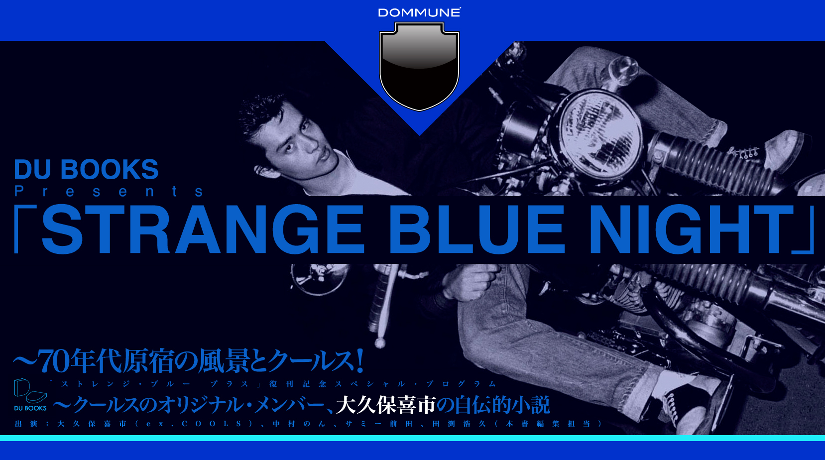 ◼︎「STRANGE BLUE NIGHT」 常識や道徳に関係なく、自分に素直にやりたい放題行動する主人公キイチの70年代原宿でのSEX, DRUGS and R&Rの日々とはいったい何だったのか? 【第1部】テーマ:70年代原宿 ■ゲスト:中村のん(70’HARAJUKU著者、スタイリスト) サブカルチャーという言葉がまだない当時、時代の感性を創り上げるファッションの聖地であり、文化の発信地だった70年代原宿についてのトークセッション。 【第2部】テーマ:復刊『ストレンジ・ブルー プラス』解体!!! ■ゲスト:サミー前田、田渕浩久 15年振りに復刊された『ストレンジ・ブルー プラス』に何が書かれているのかを解説。時代の波に乗りながらも飲み込まれていったクールスというバンドと世相を掘り下げたトークライヴ。 【第3部】テーマ:IN THE USA ■ゲスト:サミー前田、田渕浩久 筆者がCOOLSのレコーディングで訪れたニューヨークで受けたカルチャーショック。COOLS脱退後に移住したアメリカで見たリアルロックとロックが生まれる文化的土壌についてのトークセッション。 |