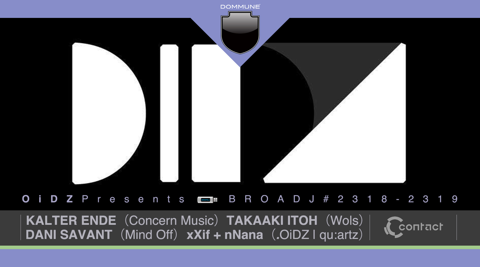 Keep your eyes pilled for coming exclusive line up artist announcement.DOMMUNE will present an exclusive line up from the amorphouz underground techno dj event in Tokyo called - .OiDZ This time we will launch the 3days in a row gathering party for limited attendees only and will be hitting the most classified known venues in the area. ●9.10 - RLOUNGE [ 6:00 - 13:00 Last ] ●9.11 - DOMMUNE [ 20:00 - 00:00 ] ●9.12 - KAGURANE [ 17:00 - 23:00 Last ] We proudly feature to launch our new label release based in Tokyo known as - AARGON founded by EQ.REC. We aim to collaborate this surprising weekday events, presenting everyone for the first time in Japan, We brought you our Special Guest artist from Spain, the Techno Maestro behind CONCERN MUSIC - KALTER ENDE. Linked together with the our top recommended techno artist in Japan from WOLS - TAKAAKI ITOH. Followed with our supporting lined up artist from the super famous foreign techno event scene in Tokyo from the MIND OFF - DANI SAVANT. Lastly, We represent our very own members, One of the recommended techno dj artist and live performer from the group, the extraordinary top notch Duo Djs - NNANA and XXIF - the organizer and founder of .OiDZ and QU:ARTZ. We are equiped to brought you another new ingredients to enhance an amorphouz meaning between space, sound and mankind. Experience the rare collabs of amorphous techno sessions live on stream. It's Time for a very Deep Under, Take a Deep Breath and Encounter Techno! Feel the . O i d Z ' |