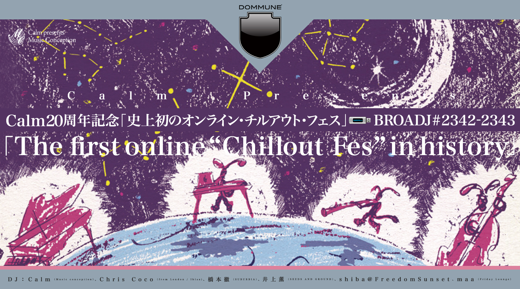 Calm20周年メモリアルコンサートに向け、チルアウトシーンで活躍する所縁ある仲間達が集結。「史上初のオンライン・チルアウト・フェス」をオリジナルスタイルで繰り広げます。バレアリックメロウな選曲を中心に、ゆったり心地よい秋の夜を演出。DJ達もホームパーティーのようなくつろいだ雰囲気でお届けしますので、ぜひリラックスしてお楽しみください! |