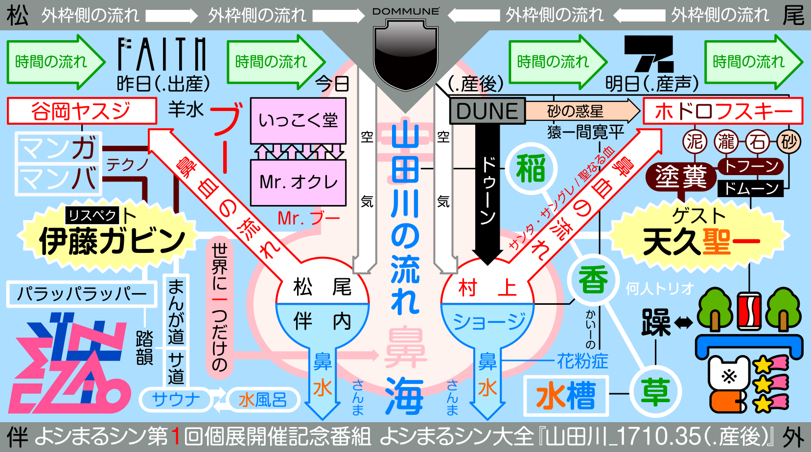 よシまるシン 第1回個展『山田川_1710』の開催を記念し、よシまるシンの過去作品や個展の内容について、ゲストに天久聖一さんをお迎えし、共にお話しさせて頂きたいと思います。今回、番組出演にあたり、DOMMUNEテロップもよシまるシン自ら作成させて頂きました。テーマは「鼻水槽図」。培養液に浮かぶ脳のごとく、DOMMUNEテロップフレームを水槽に見立て、中心に自らの鼻を置き、全体を「謎の図」にしました。「謎の図」とは、よシまるシンが手がける作品の形式のひとつで、個展でも重要な役割を果たしています。個展では、これまでの活動/作品が、空間の中で全て繋がっているような、まさに「謎の図」の空間バージョンのようなものの構築を目指しました。結果、その空間バージョンの「謎の図」は、それ自体がある種の「パワースポット」であることを示すものになりました(ただしその「パワー」は「松尾伴内」と「松尾伴外」という二つのベクトルを持ち、それらによって相殺され、無になります。つまり、ここで展開しようとしたのは、自分なりの「パワーゼロスポット」のビジョンなのです!)。果たしてそれがうまくいったのかどうか、ゲストと共に、検証したいと思います。最後に、「松尾伴内」と「松尾伴外」について少しだけ補足させてください。この二つのキーワードには、重層的な意味が畳み込まれています。創作への内的欲求を「伴内」、外的制約を「伴外」と言い換えることもできますし、アートの文脈内、アートシーンのゲームボード内が「伴内」、それ以外(例えばアウトサイダーアートのような)が「伴外」とも言えます。そしてもちろん個人としての「松尾伴内」、それ以外としての「松尾伴外」という意味も。ちなみに個人としての「松尾伴内」には、「両性具有(男女兼用)」「原始」の象徴としてのイメージがあり、山田川における「神」(もしくは楳図かずおの「わたしは真悟」における「シンゴ」?)の役割が与えられています。そして最後の最後にいきなり出てきた「山田川」ですが、説明するスペースがなくなってしまったので、ぜひ、放送内でお話しさせてください! |