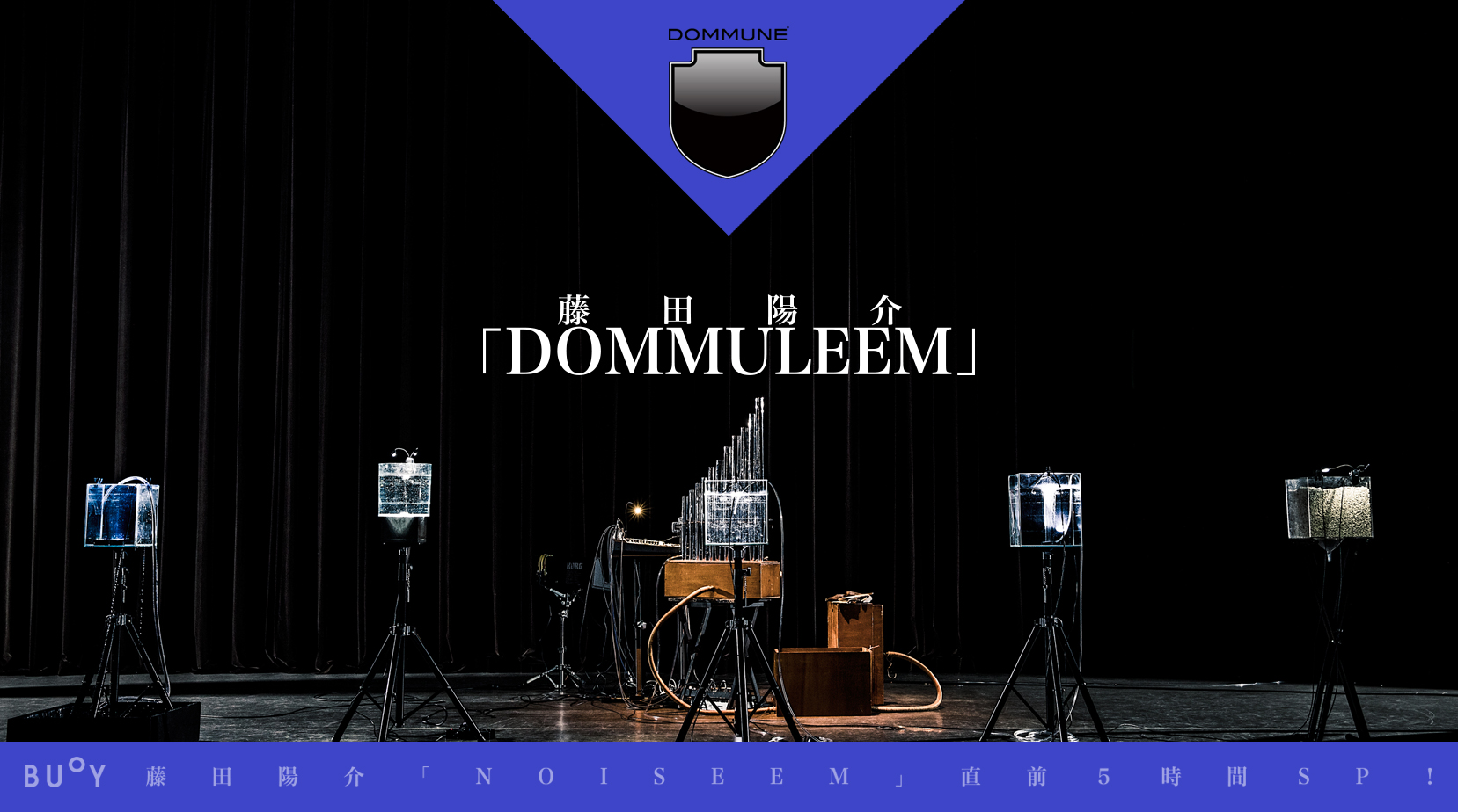 2015年に上演した「MEMOLEEM/メモリーム」(ボアダムス・EYヨと藤田陽介による共作舞台)以降、一貫して水を扱い続けてきた藤田陽介が、元銭湯であるを利用した劇場空間北千住 BUoYで新作「NOISEEM/ノイジーム」を4/6〜7まで、制作・上演する。音響設計はサラウンド・サウンドシステムで多方面から定評のあるWHITELIGHTが担当し、照明は平曜が担当する。この公演を記念してDOMMUNEでは「NOISEEM」直前5時間SP!『藤田陽介「DOMMULEEM」』が配信される!「NOISEEM」というNOISE+LEEM(水を意味する)から成る造語であるが、この番組の冒頭2時間は、東京都現代美術館の藪前知子を聞き手、詩人の吉増剛造をゲストに、当日スイッチング中のDOMMUNE宇川直宏も参加して、「NOISEEM」のコンセプトを解析する。その後、公演の直前番組であるにも関わらず、公演とは全く別の新作として、今度は、 DOMMUNE+LEEM(水)=「DOMMULEEM」と名付けた、なんと3時間の作品=パフォーマンスを世界初披露する!絶対必見の5時間! |