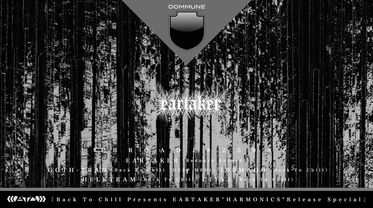 GOTH-TRADが2006年にマンスリーイベントとしてスタートた”Back To Chill”は、今年9月に12周年を迎えた。Dubstepを軸としながらも日本発のヘビーウェイト/アンダーグラウンドサウンドを追求・融合し、ジャンルレスなイベントを開催してきた。今回は、2017年にGOTH-TRADがDiesuck(Voice)・Masayuki Imanishi(Noise)とともに結成したバンド”EARTAKER”のデビューアルバム”Harmonics”(Bedouin Records)のリリースを記念し、DOMMUNEでは、EARTAKERのミニライブと未発表音源盛りだくさんのBTC crewによるDubplate Sessionをお送りします! |