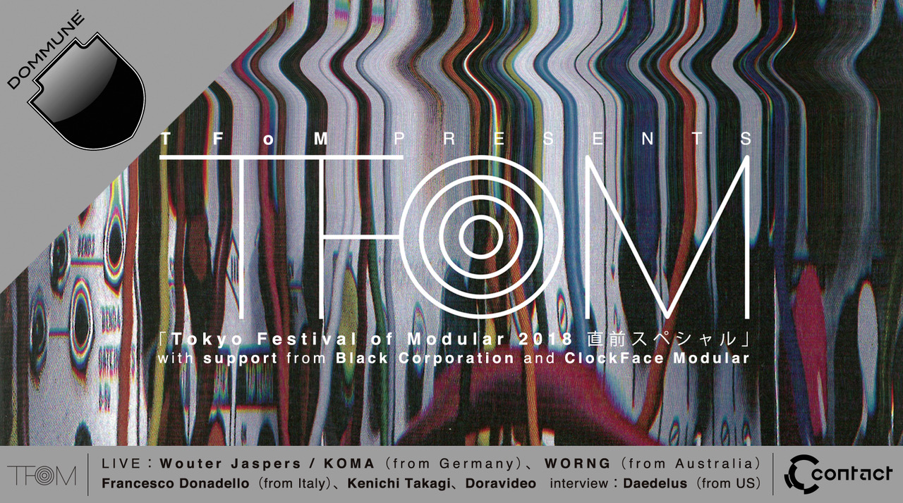 世界中のモジュラーシンセメーカーや著名アーティスト、更には著者を招いて、電子楽器の見本市、レクチャー、コンサート、中古モジュールコーナー、初心者向けコーナーまで、ビギナーからマニアまで、モジュラーシンセの魅力を掘り下げ、楽しみ、体験する2日間。そのエッセンスを『TFoM2018』(直前の水曜日、DOMMUNEにて紹介!今回ライブをするモジュラーシンセを使い始めたDaedelusへのインタビューはじめ、モジュラーシンセを使ったライブ演奏者をピックアップしてお届けします。 |