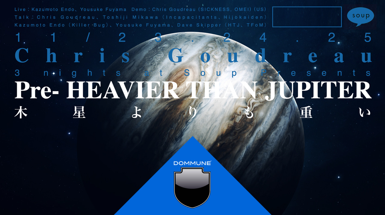 日本の誇る激ヤバ面々が落合SoupでChrisを迎え撃つ格好で、シリーズイベント"Heavier than Jupiter"の特別編が3日間に互り開催される!ミルトンの『失楽園』とダンテの『神曲地獄篇』をテーマに、Soupの擁する4チャンネルサラウンドシステムを駆使して繰り広げられる驚異のショーケースは必見!!!そして、今夜 Dommuneでは、このイベントに先立ち、日本のノイズレジェンド T. Mikawaと Kazumoto Endo、国内外から絶賛評価されているオーディオヴィジュアルアーティスト Yousuke Fuyama、そして、"Heavier than Jupiter" のオーガナイザーの Dave Skipper をゲストに迎えて、Chris とノイズに関するディスカッションを行う。ライヴもあり! |