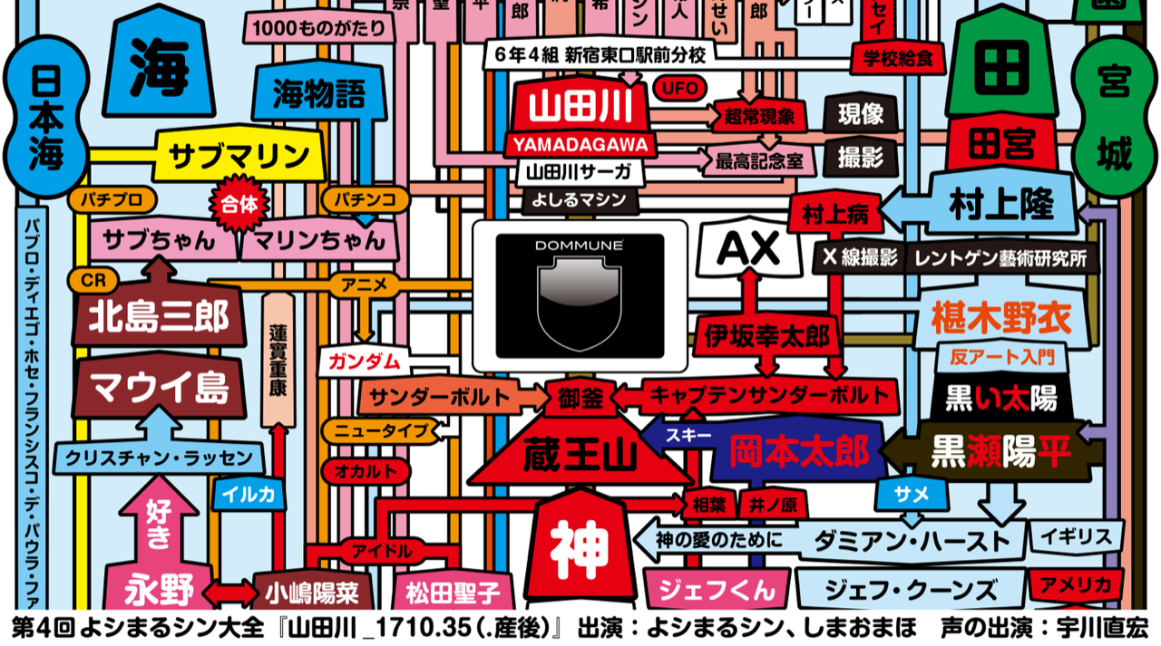 今回で第4回目となる本番組では、12/15(土)からCALM & PUNK GALLERYで行われるグループ展「『擬似マウンテン』in Tokyo」に展示される巨大相関図、先日行われた「ニュウ・ムンク展」で展示された『ムンク図』等、よシまるシンの「謎の図」シリーズ近作を、ゲストのしまおまほさんに鋭いツッコミを入れて頂きつつ、よシまるシンが解説したいと思います。なお、その模様はそのまま「『擬似マウンテン』in Tokyo」に展示される巨大相関図の中に埋め込まれ、展示される予定です! |