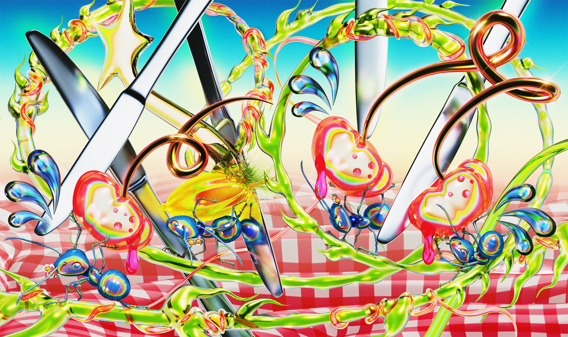 哲学を題材としたコメディードラマ「Good Place」や「トロッコ問題」などに影響を受け制作される本展では、村田自身の個人的なロンドンでの思考体験を元に蟻のミクロの視点から、来場者とともに「持続可能な豊かな生活とは何か」を考えます。また来場者は会場でおにぎりを握ることができ、女王アリにお供えをすると悪態をつく音声を奏でることができます。村田の作品は2020年に盗めるアートで制作された「Gods and mom believe in you」の信仰心にまつわる実験的作品から倫理的視点へと移行され、本作では蟻という人間のメタファーを用いて、風刺的に人間活動の豊かさを探究します。「持続可能な豊かな生活とは何か?」というと一見壮大な問いですが、ここで着目したいのは個人が豊かだと感じられる生活かどうかであり、一個人が豊かだと感じる瞬間的な体験の連続が社会全体を持続可能にすることを示唆しています。また3月8日のオープニングレセプションにはアーティストのKOM_I(コムアイ)とのパフォーマンス 、3月12日にはDommuneにてアーティストトークを実施。展示期間中、会場では映像作家の岡大夢とのコラボレーション作品「美しいニュース」が展示されます。