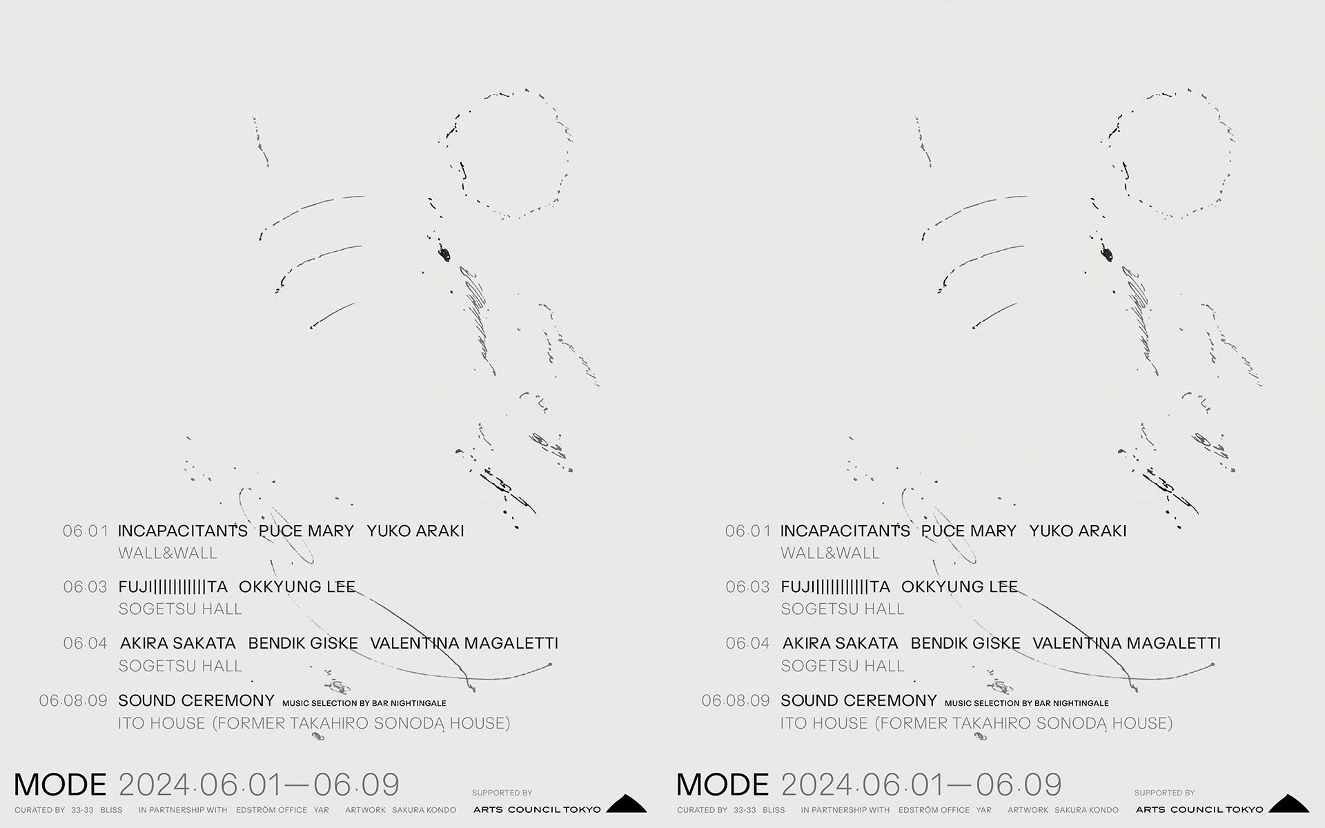 出演アーティストには、DiorのAutumn-Winter 2022-2023のショーミュージックを担当した初来日のBendik Giske(ベンディク・ギスケ)をはじめ、一昨年にLEMAIREとコラボレーションしたTomaga(トマガ)のパーカッショニストValentina Magaletti(バレンティーナ・マガレッティ)や、数々の大物アーティストとのコラボレーションなどで注目を集めるOkkyung Lee(オッキュン・リー)、そして、INCAPACITANTS(インキャパシタンツ)、Puce Mary(ピュース・マリー)、Yuko Araki(ユウコ・アラキ)、坂田明、FUJI|||||||||||TA(フジタ/JP)など錚々たる顔ぶれが集結。世界各国から高い評価を受けるアーティストによる刺激的なパフォーマンスに注目!パフォーマンスプログラムに加え、6月8日と9日には日本モダニズム建築を代表する建築家・吉村順三が、日本のピアノ界、クラシック界の功労者であるピアニスト・園田高弘のために建てた邸宅「伊藤邸(旧園田高弘邸)」で音楽体験を楽しめるホームリスニングプログラム「SOUND CEREMONY」も開催される。この開催を記念してDOMMUNEでMODE 2023のMERZBOW のWWWでのLIVEを世界初公開!そして来日中のPUCE MARYの緊急生LIVEをストリーミング!!! 世の電子音楽ラヴァー全員必見のプログラム!!!!!!