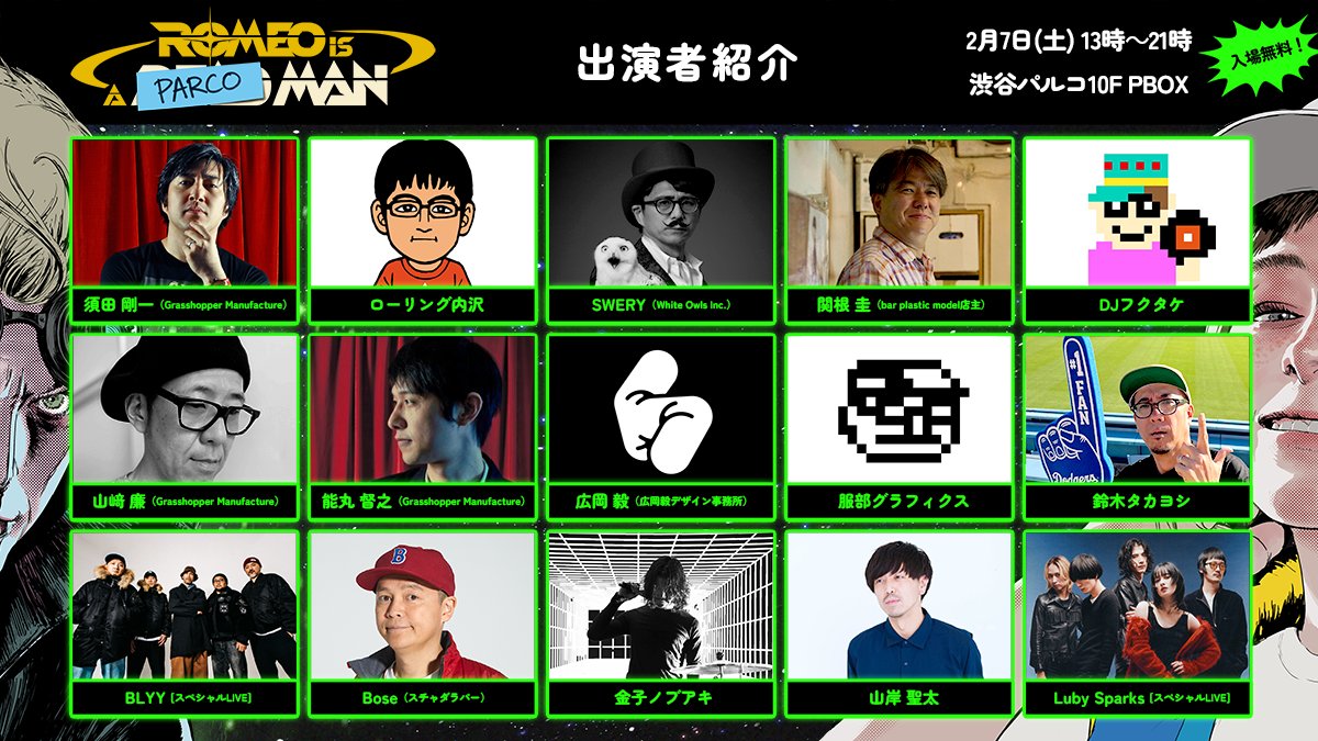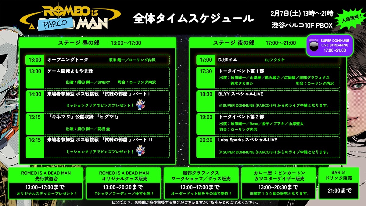 ■グラスホッパー・マニファクチュアが送る、待望の完全新作アクションアドベンチャーゲーム『ROMEO IS A DEAD MAN』。その2月11日の発売を目前に控え、緊急特別企画としてイベント「ROMEO IS A PARCO MAN」が渋谷PARCO 10Fの「PBOX」にて開催。この日限りの怒涛のセッションをDOMMUNEより完全生配信でお届けします。
