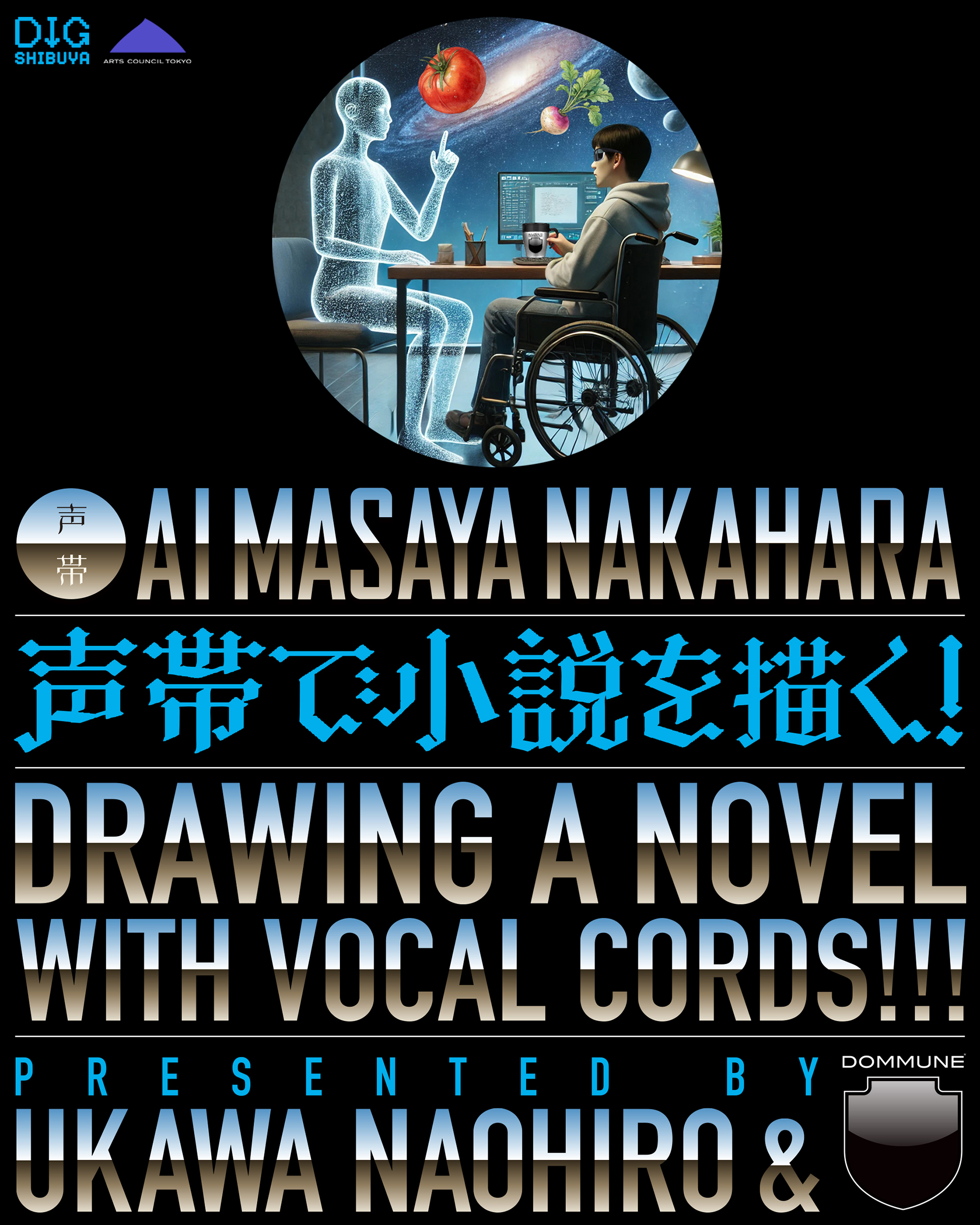 <声帯AI中原昌也とAI宇川直宏による小説&映像生成ワークショップ>が2/13金〜2/15日、DIG SHIBUYAのオフィシャルプログラムとし渋谷PARCO9F DOMMUNE & 10F PBOXで開催!インスタレーション作品「声帯A I 中原昌也」と共に対話形式で描く小説講座「あなたの声帯で小説を描く! 」を一般者向けのワークショップとして3日間開放!。そこで参加者がA Iと共に描いた小説を今度はプロンプト化し、A I 宇川直宏が動画化する「あなたの声帯で小説を動かす! 」を2/15日にPBOXで展開!。世界でも類を見ないマルチモーダルなワークショップシリーズを渋谷で展開し、生成A Iと共生しながら嘗て体験したことのない身体感覚から生み出される創作のネットワークを共有する。これは生成A Iと共生する時代の“もう一つの身体性” を発見する試みであり、声の震えが物語へと成長し、視覚イメージへと再生成される新たな創造の実験場なのだ。年齢・性別・国籍・言語、そして障がいの有無を問わず、誰もが生成/ 創造できる超ダイバーシティ・声帯ワークショップなのだ! !
