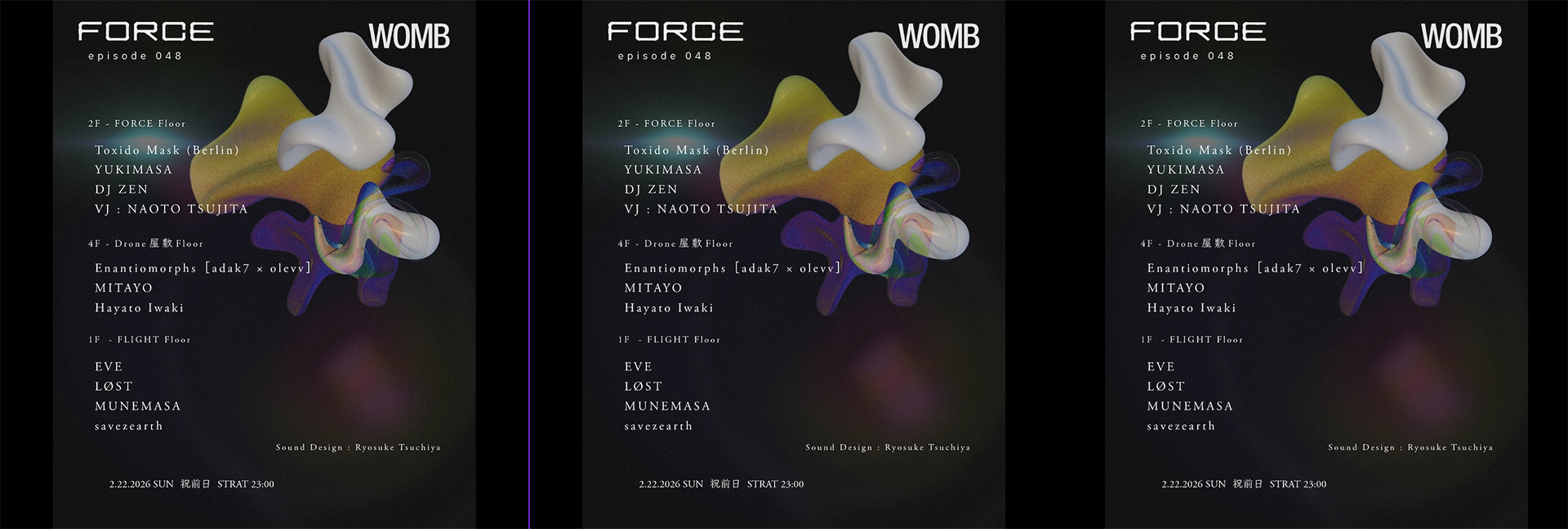 東京のテクノシーンの深層で、確実に積み重ねられてきた FORCE。YUKIMASA主宰のもと、表層的なムードに迎合することなく、音そのものが持つ本質と精神性を軸に、これまで48のエピソードを重ねてきた。クラブという空間を「消費」するのではなく、音と身体、時間と意識が交差する“場”として再定義を続けること。それがFORCEの一貫した姿勢であり、理由だ。今回ゲストとして迎えるのは、ベルリンの名門クラブ Tresorのレジデント Toxido Mask。そのプレイは無機質でありながら生々しく、建築的でありながら衝動的。昨今の一時的な流行ではなく、脈々と続いてきたベルリンのリアル・アンダーグラウンドの現在地を体現するDJスタイルは、FORCEがこれまで築いてきた文脈と、必然的に交差する。国内からは10年以上に渡り東京の東側を拠点に深化を続けるパーティ Drone 屋敷を主催する olevv と adak7 によって構成されるb2b デュオ Enantiomorphs と、RAVEパーティ FLIGHTを主催するLØST が出演。2/22(SUN) にWOMBにて開催された FORCE episode 048 のアフターパーティを兼ねて、DommuneでのFORCE Showcaseが実現する。
