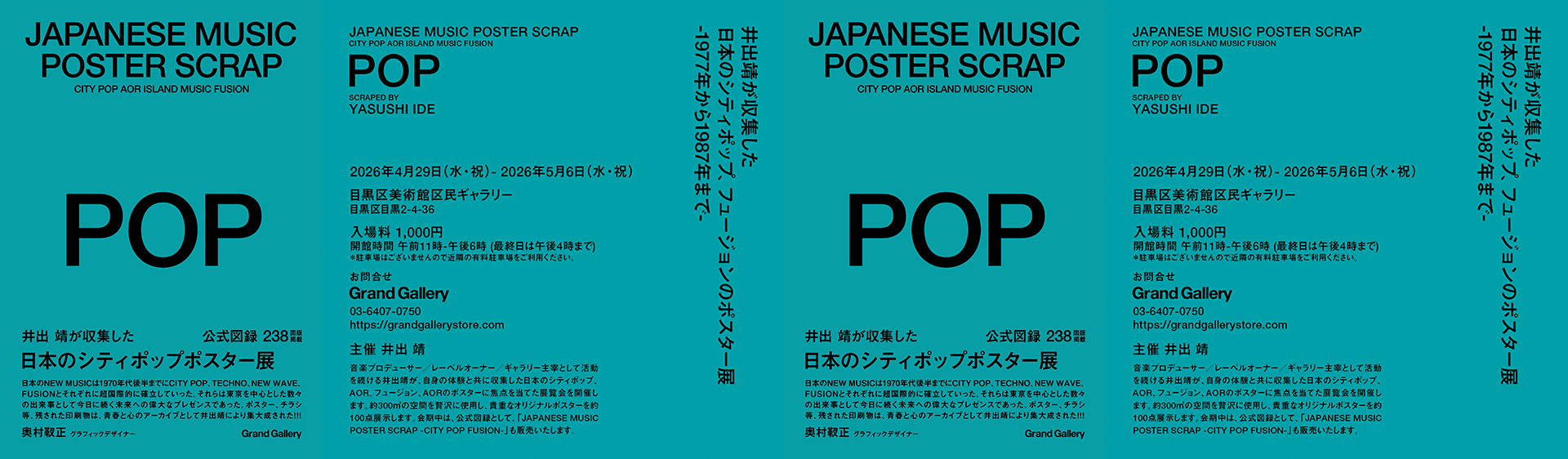 そして今回、「井出靖が収集した日本のシティ・ポップ、フュージョンのポスター展 -1977年から1987年まで-」の開催が決定。4月29日から5月6日まで目黒区美術館区民ギャラリー、7月14日から7月20日まで福岡県立美術館にて実施される。約100点以上のオリジナルポスターが並ぶ本展は、当時の印刷物の質感と迫力を体感できる貴重な機会となる。また会期中は、公式図録『JAPANESE MUSIC POSTER SCRAP - CITY POP FUSION』も販売される。